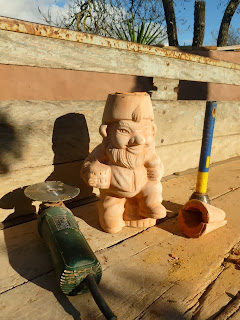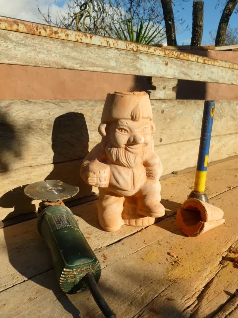 Não gosto muito de ver estes bonecos em jardins, mas como me foi oferecido, achei que seria um desrespeito não o usar. Como já há algum tempo que andava à procura de um vaso digno para esta minha suculenta, e como o boneco era oco por dentro, não pensei duas vezes. Cortei-lhe o gorro e dei-lhe, em vez disso, uma bela cabeleira verde. Será certamente mais uma daquelas peças capazes de arrancar um sorriso a quem passa por ele. Uma coisa é certa: comecei a olhar para estes bonecos com outros olhos...