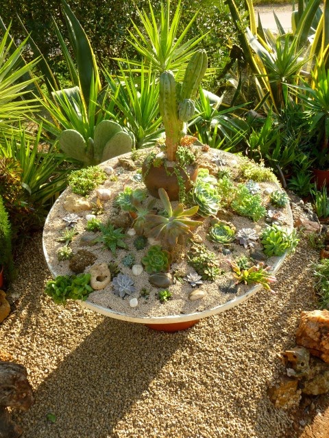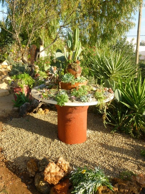 Criar soluções verdes usando estes materiais é, talvez, um desafio, logo, algo que me dá um imenso prazer. Para começar, usei uma manilha como suporte para o disco da parabólica, onde dispusemos muitas plantas suculentas. O resultado final foi uma "fonte" que, em vez de água, "jorra" uma grande seleção de plantas suculentas. Dentro de um ano, esta "fonte" estará a transbordar de plantas. Só de pensar, fico feliz.