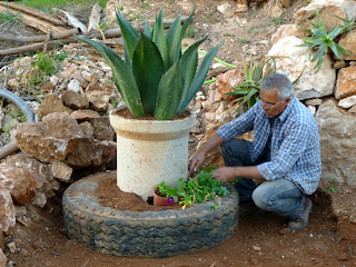 A segunda combinação de "lixo" passou por usar um enorme pneu, e uma manilha em cimento que serviu de vaso a um Agave. Entre o pneu e a manilha, foram ainda plantados amores perfeitos.