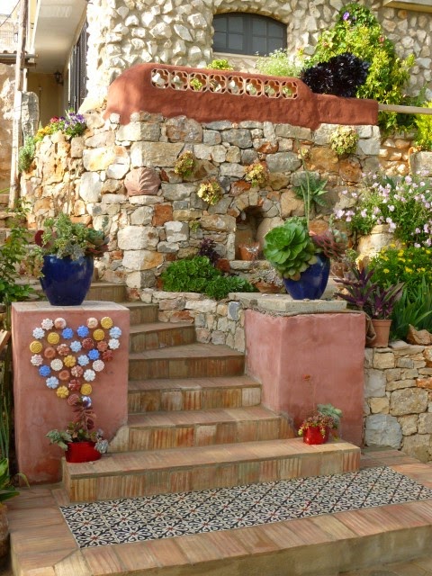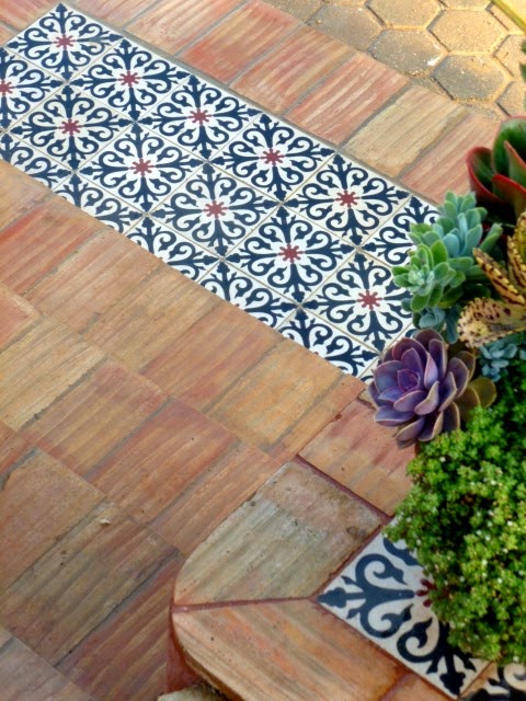 Optou-se por reutilizar alguns mosaicos hidráulicos antigos, juntamente com tijoleira de fabrico artesanal conhecida como "Santa Catarina", nome do local aqui no Algarve onde ainda hoje é feita, para forrar os vários degraus. Gosto particularmente do efeito "tapete" que se consegue com a utilização dos mosaicos.