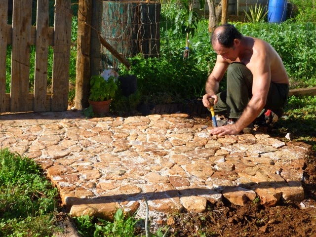 Para a maioria dos agricultores, pedras no terreno nunca são bem vistas. Normalmente são recolhidas e depositadas algures, sem que lhes seja dado uso algum. Pois bem, deixo aqui uma sugestão: que tal usá-las numa calçada orgânica como esta que agora apresento? Só é necessário alguma habilidade e jeito com puzzles para levar a cabo este pavimento, usando-se apenas o que a terra dá (neste caso, pedras).