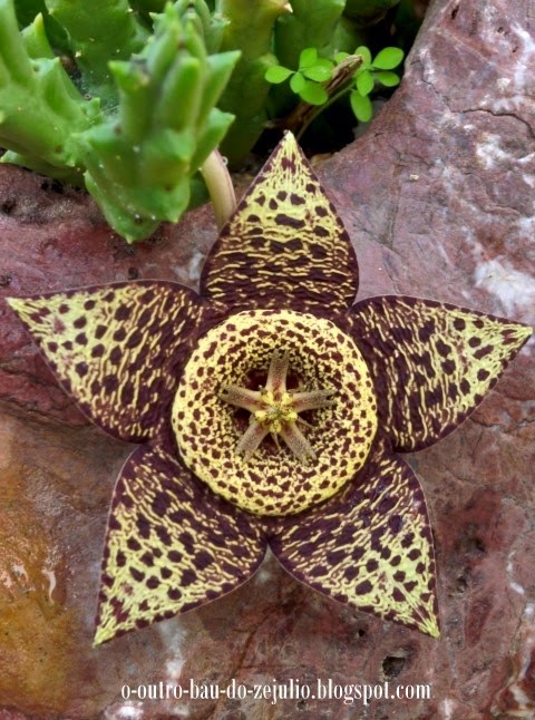 Considero-a uma das mais belas flores de planta suculenta existentes no jardim, originária do sul da África e cientificamente conhecida como Stapelia lepida.